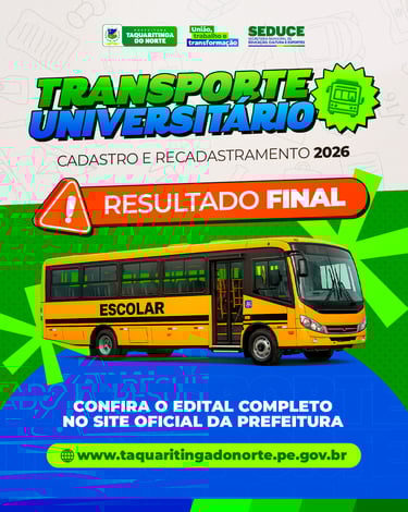 A Prefeitura de Taquaritinga do Norte divulgou, nesta terça-feira (10), o resultado final da concessão do transporte universitário gratuito para o primeiro semestre de 2026. A medida, coordenada pela Secretaria Municipal de Educação, Cultura e Esportes (SEDUCE), beneficia estudantes residentes no município que cursam graduação ou pós-graduação em instituições de ensino superior localizadas em Caruaru (PE), Santa Cruz do Capibaribe (PE) e Campina Grande (PB). O processo seletivo foi regido pelo Edital nº 001/2026, que estabeleceu critérios claros de elegibilidade, como residência comprovada em Taquaritinga do Norte e matrícula regular em cursos presenciais nas cidades contempladas.